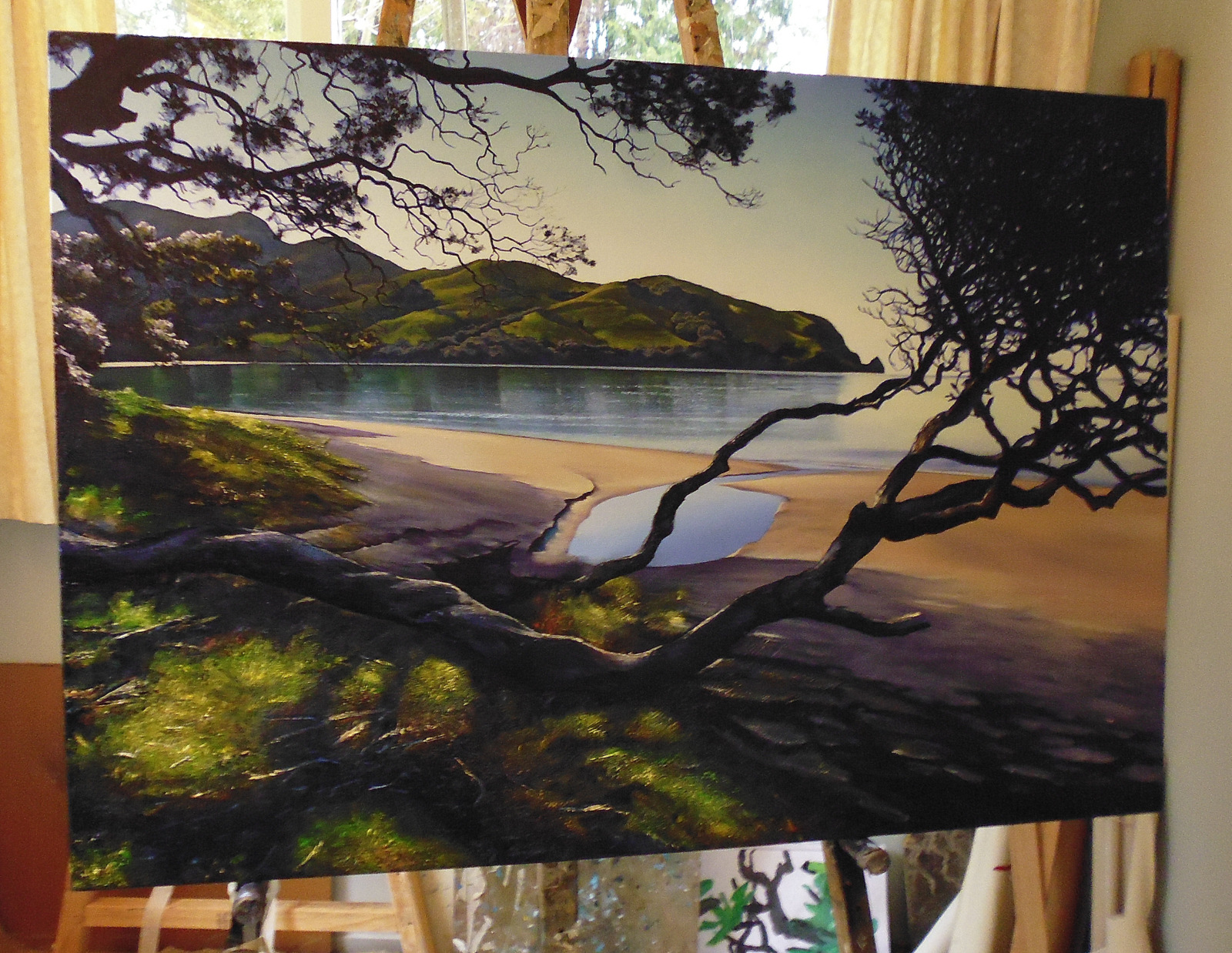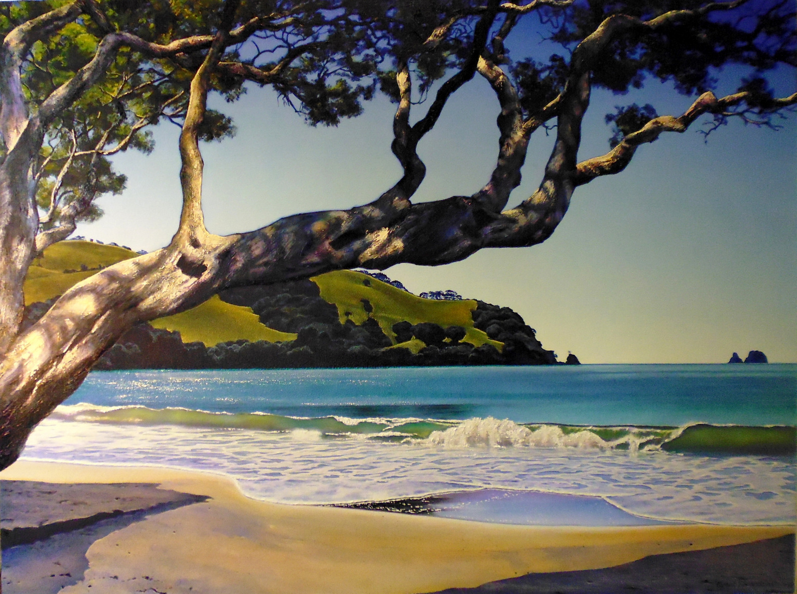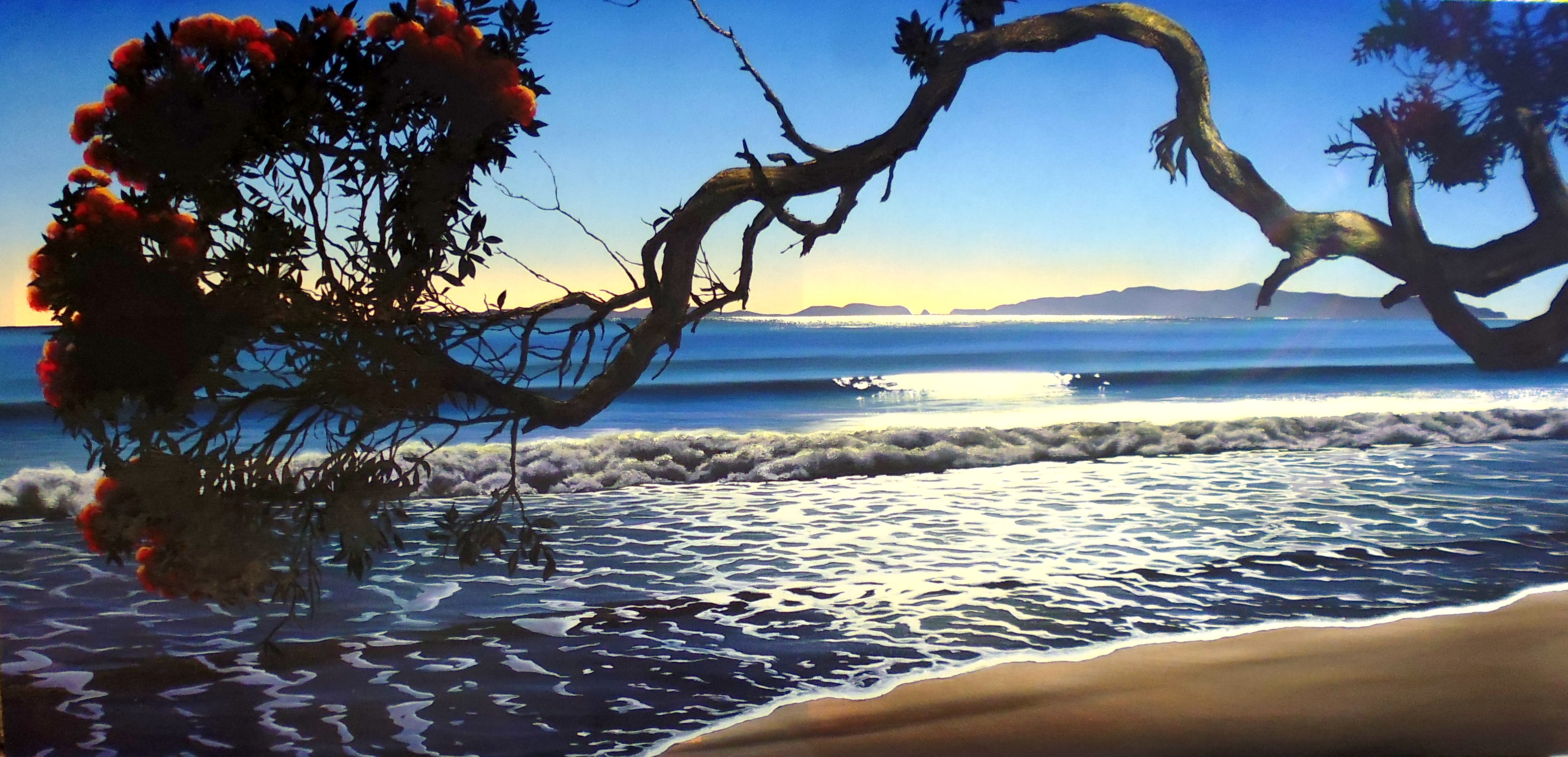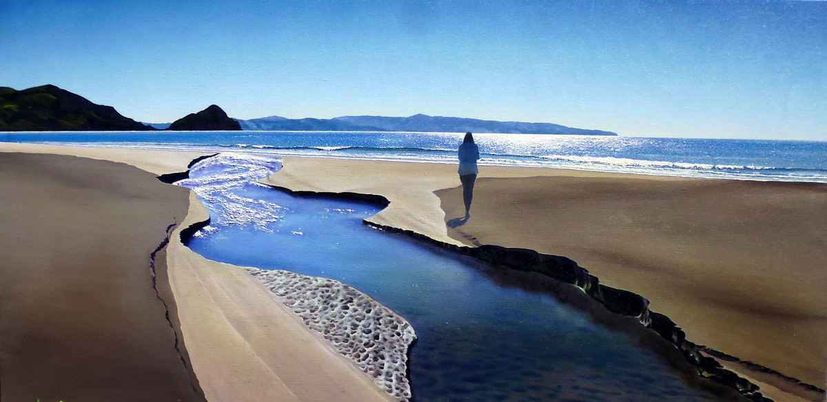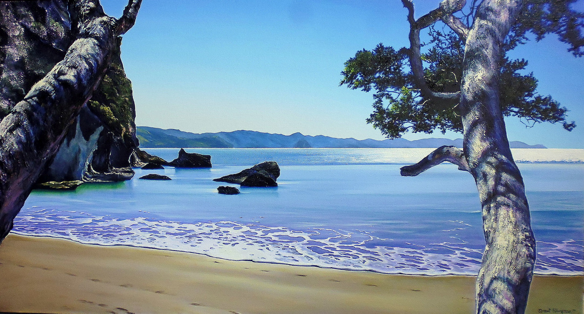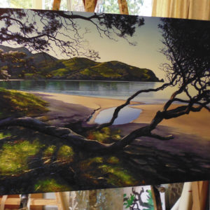 Living in the Opoutere area I work from a home surrounded by orchards and farmland. (Look for the gallery sign just south of Opoutere Orchard on SH25). The rich Coromandel art scene and the area itself is a big motivating factor. The many artists working away in their home studios, the art trails in Coromandel and Mercury Bay, and especially the galleries headed by such knowledgeable people.
