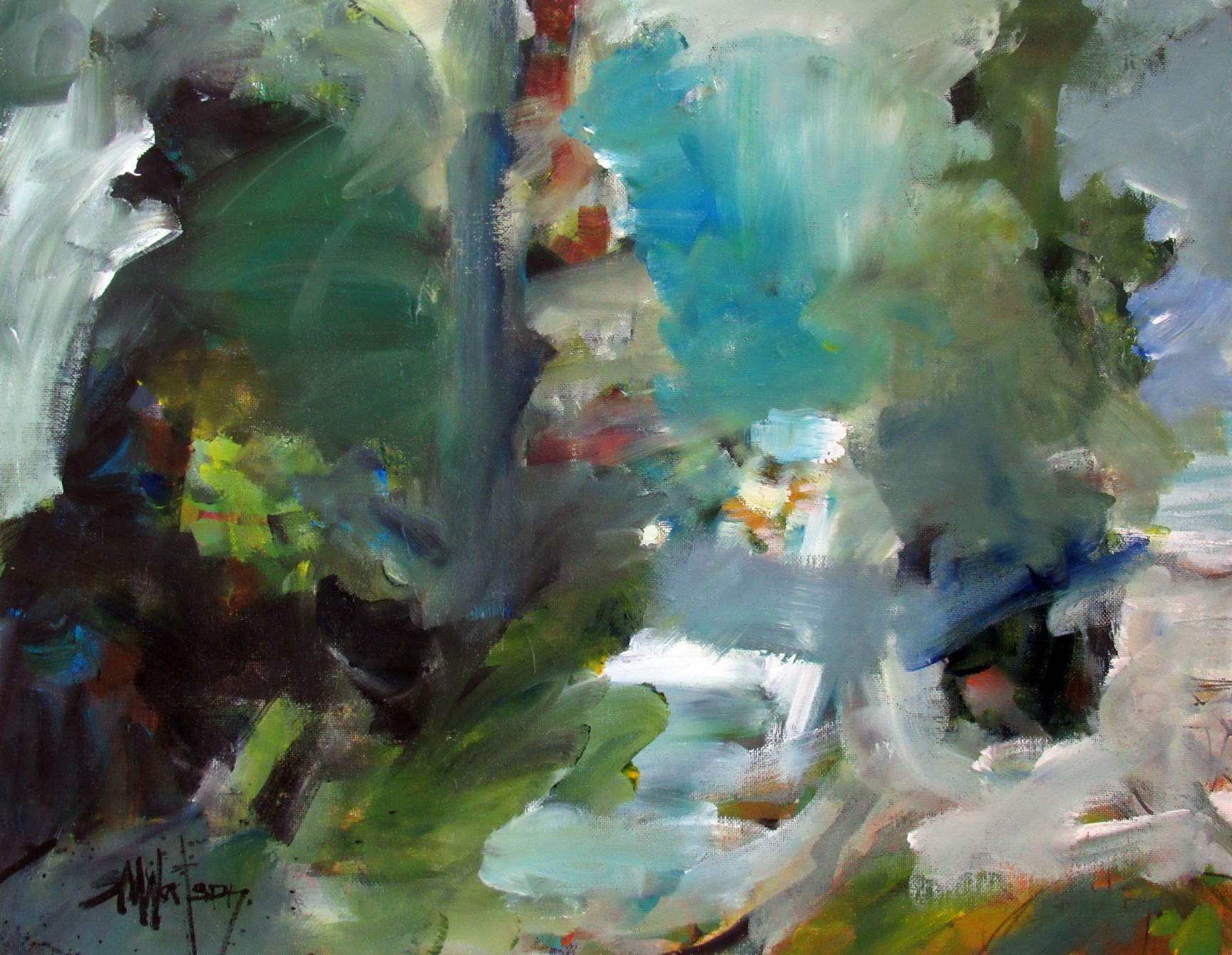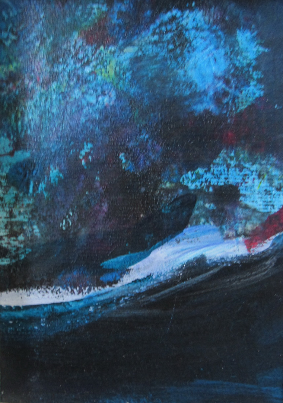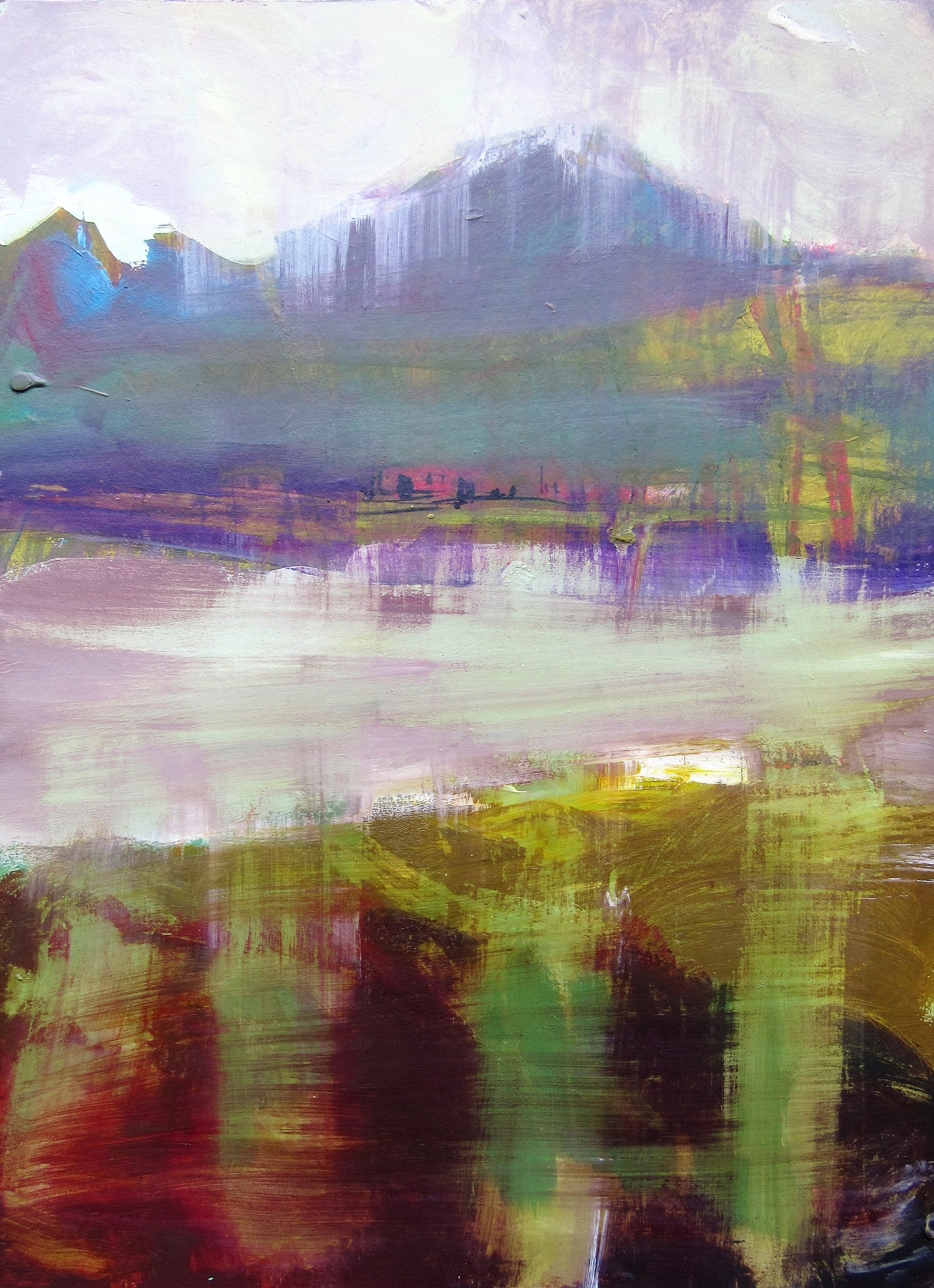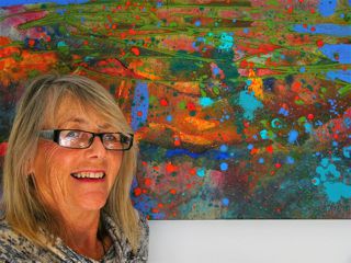 How I work – I usually start a painting by playing with colours and textures. There’s a great deal of splashing, dripping, layering and turning of the canvas. Gradually the marks begin to suggest subject matter which I may or may not develop further. I love loose brushstrokes, multi layered texture, the play of colours one against the other, and the search for a final image.