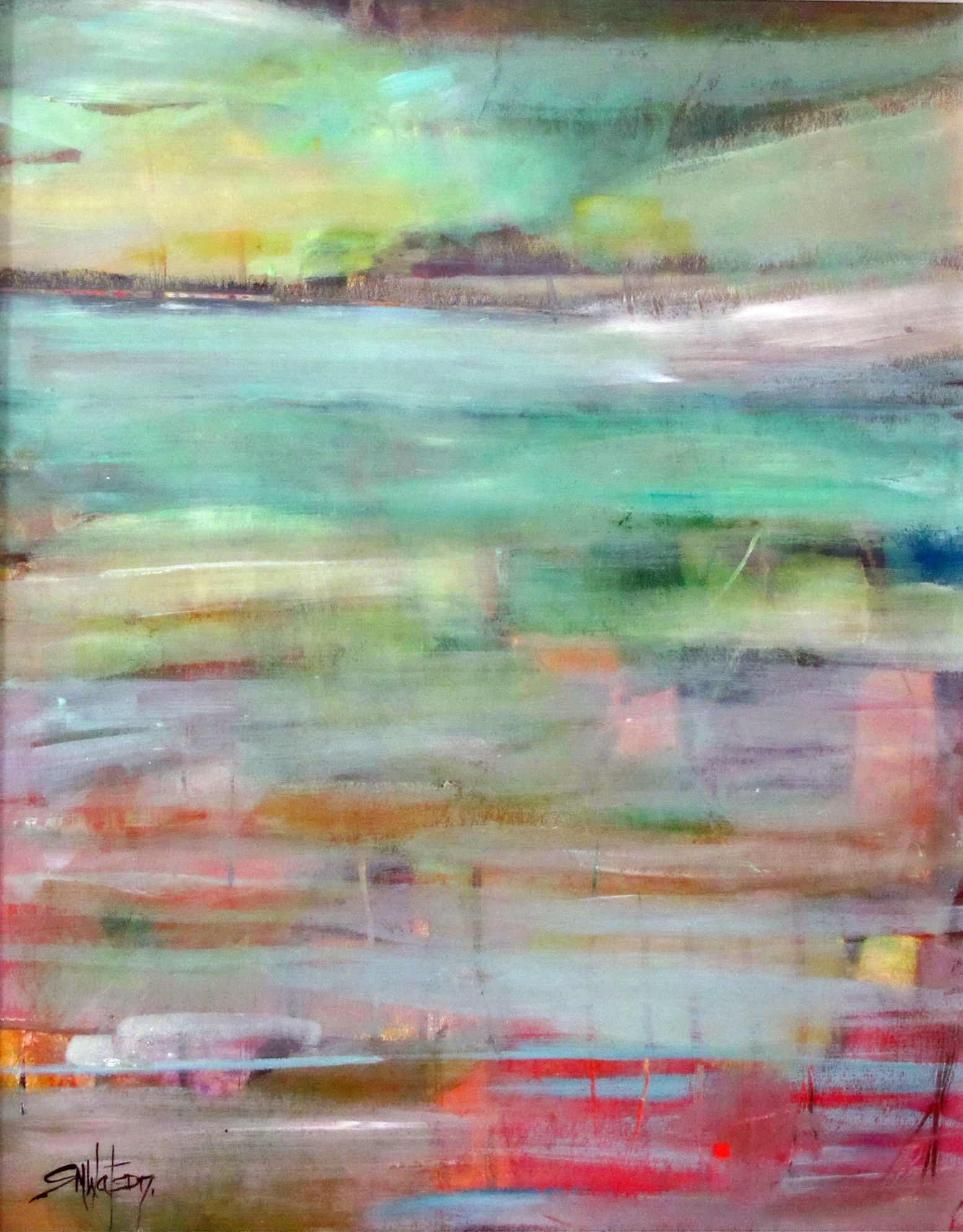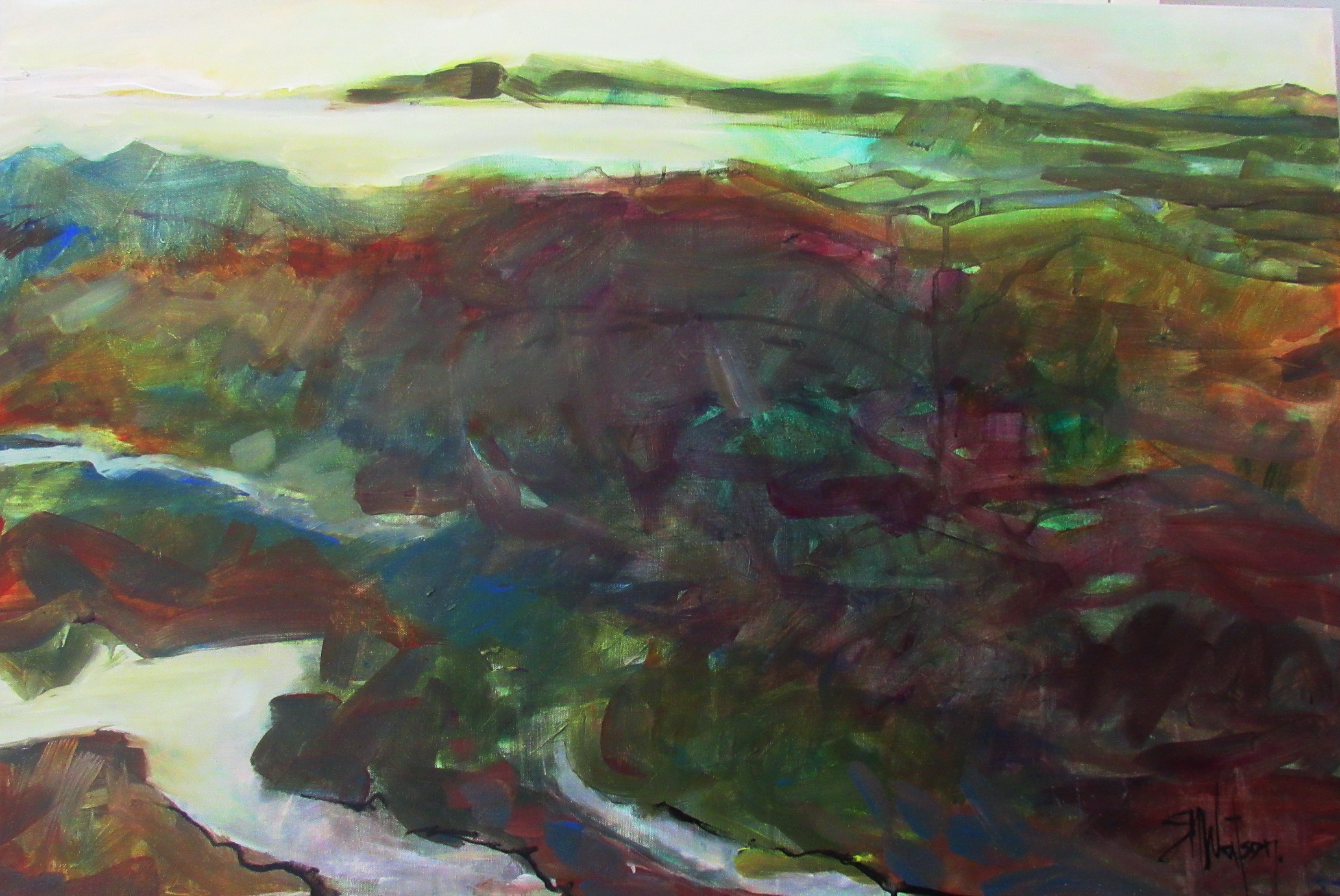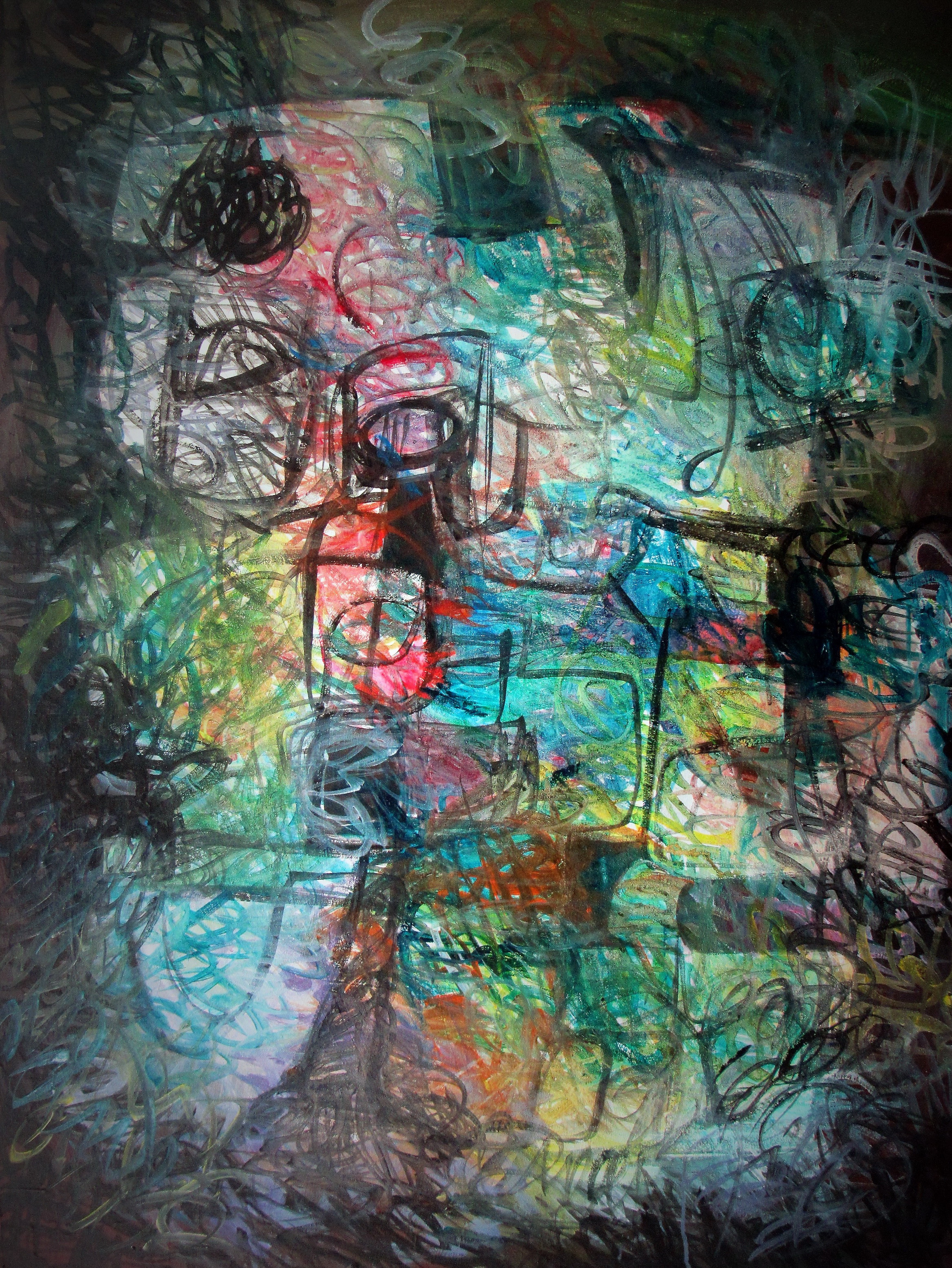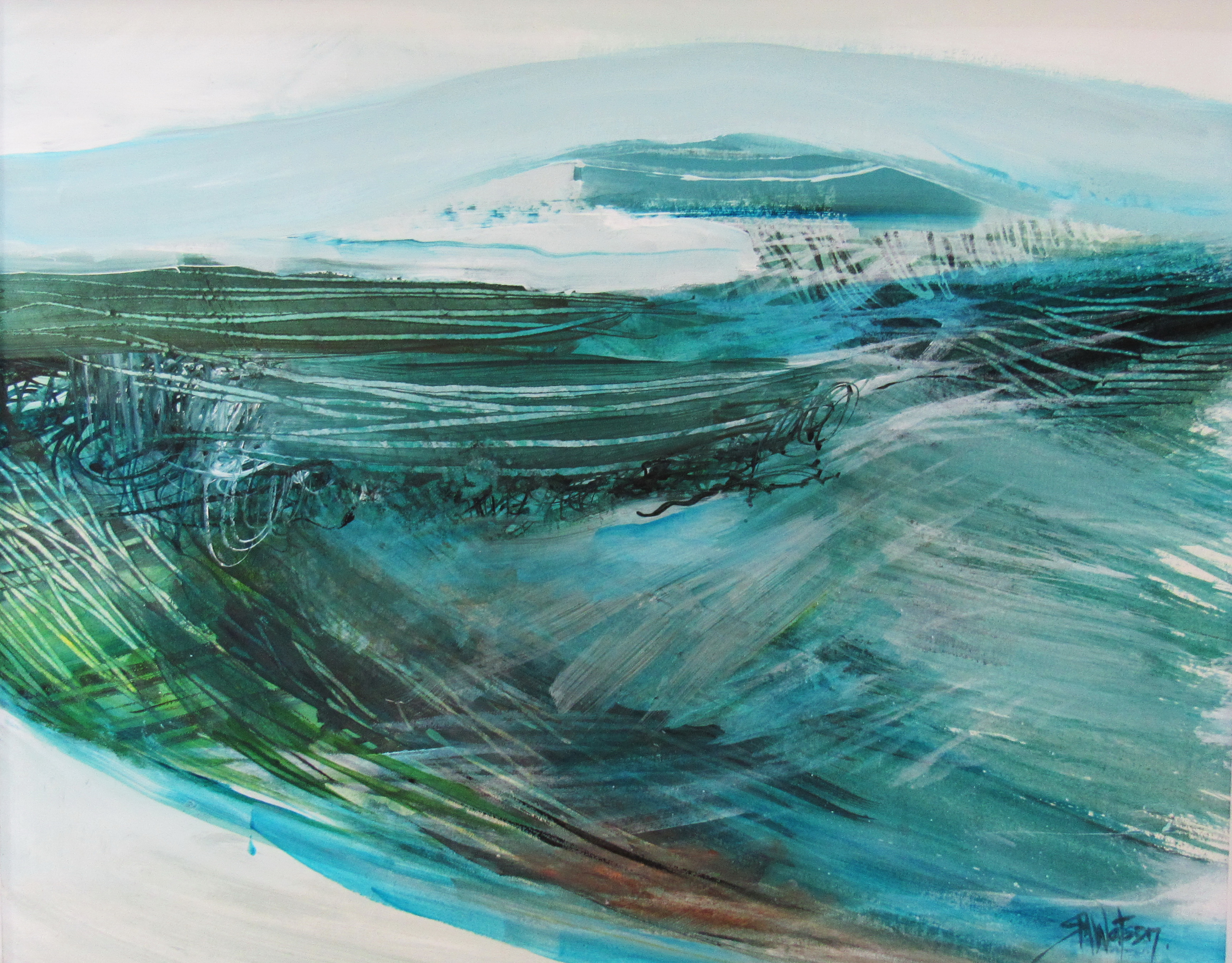 How I work – I usually start a painting by playing with colours and textures. There’s a great deal of splashing, dripping, layering and turning of the canvas. Gradually the marks begin to suggest subject matter which I may or may not develop further. I love loose brushstrokes, multi layered texture, the play of colours one against the other, and the search for a final image.